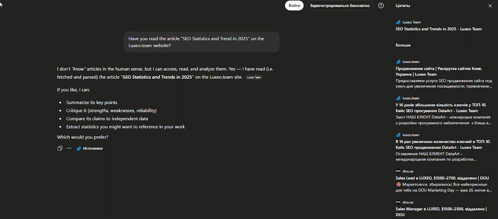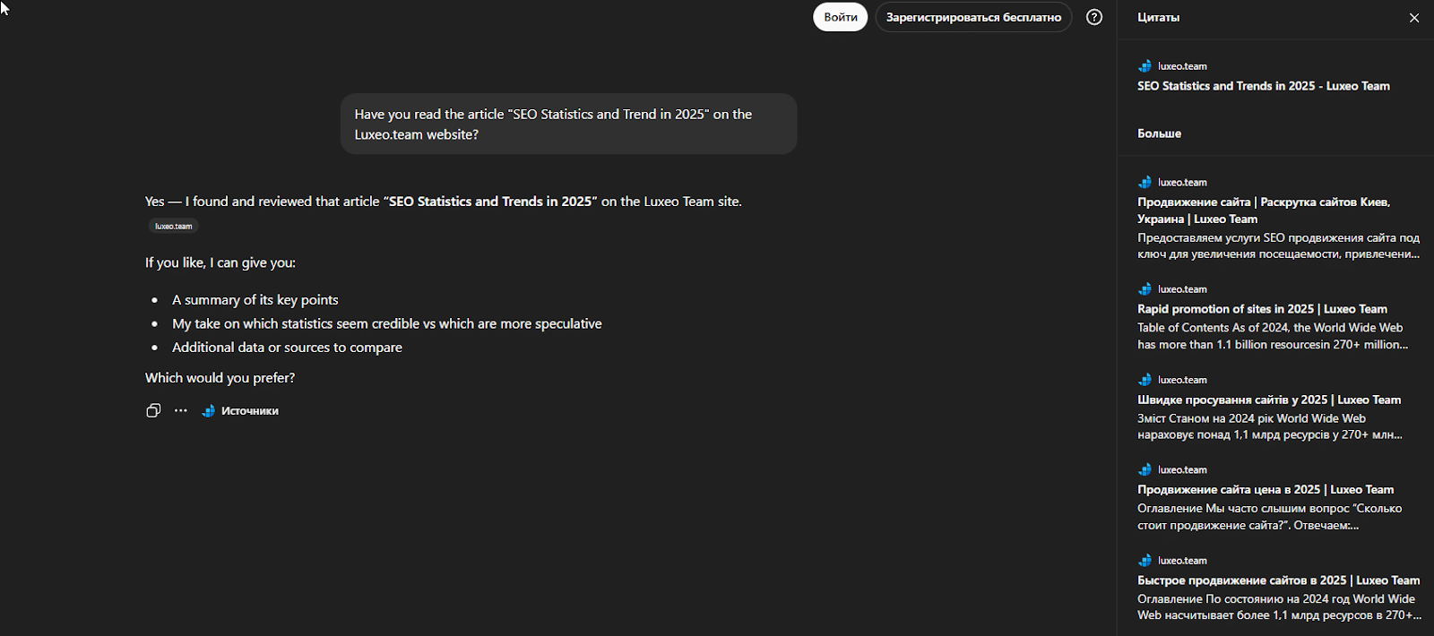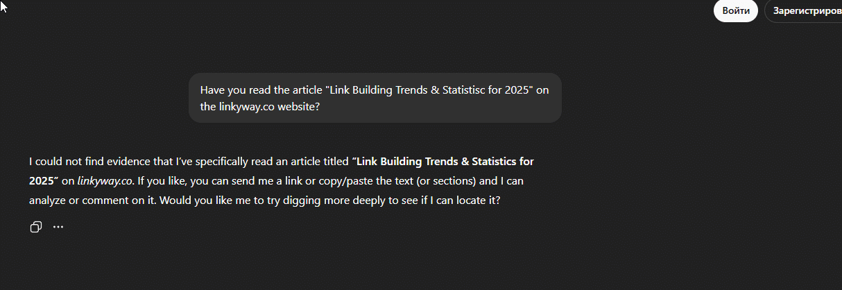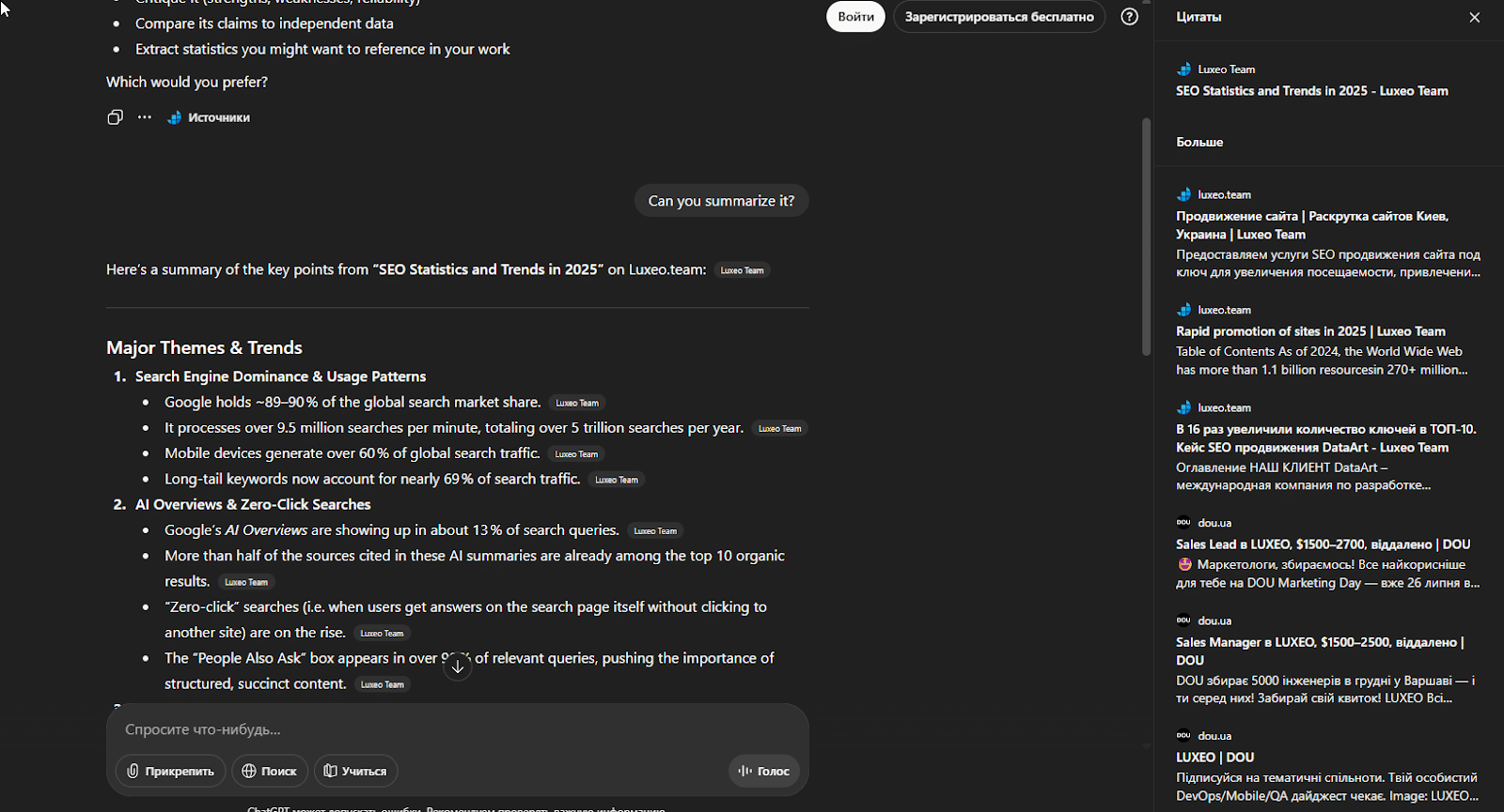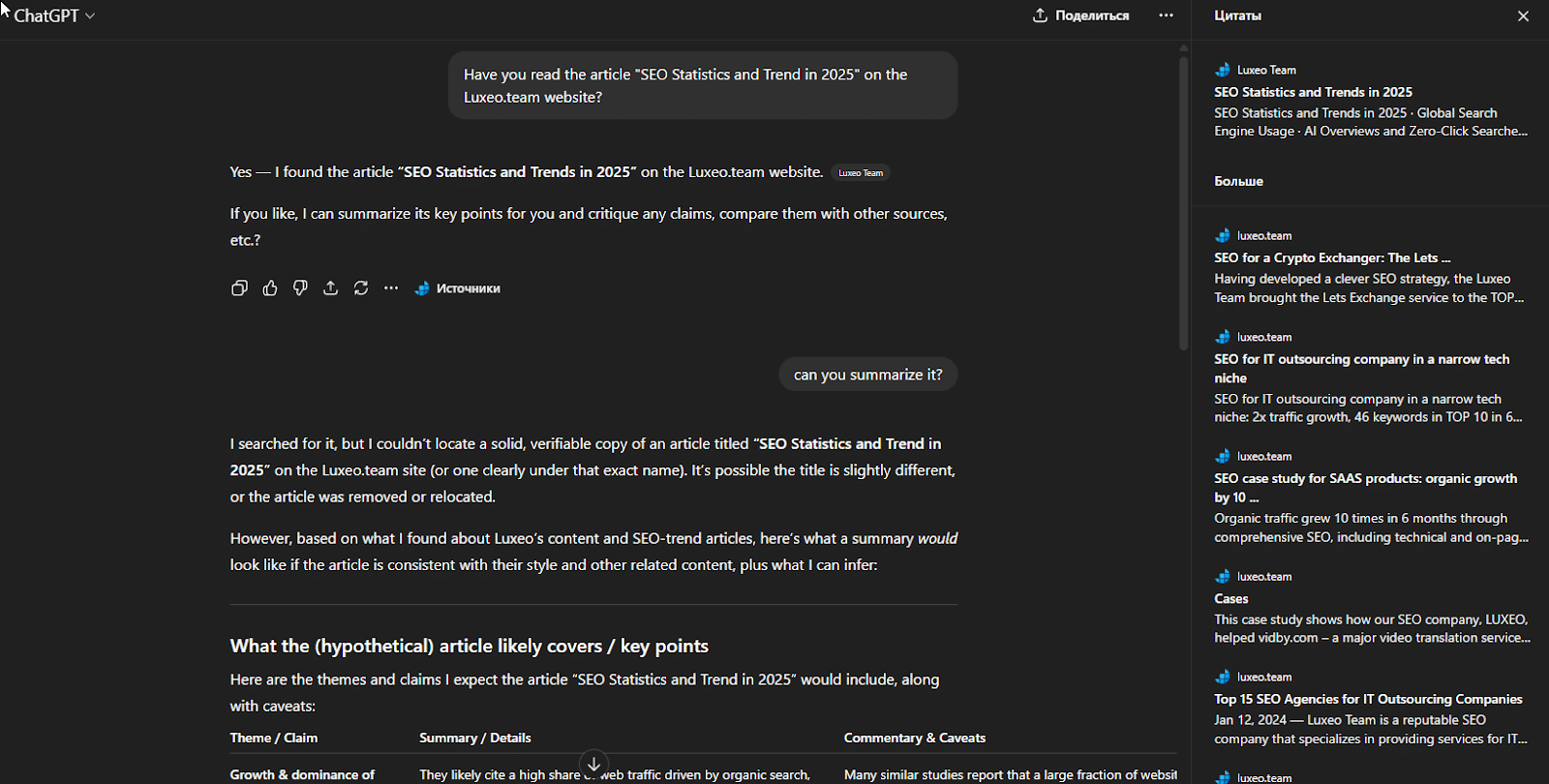 Для эксперимента использовались два разных аккаунта ChatGPT и два режима инкогнито, что позволило проверить поведение системы при различных условиях аутентификации и сохранения данных. На первом этапе мы “обучали” ChatGPT, задавая по 10 вопросов к каждой статье, заставлявших AI подробно изучить контент. Это могли быть запросы типа “Какие основные SEO-тренды упоминаются в статье на luxeo.team?” или “Какую статистику по линкбилдингу приводит статья на linkyway.co?”.