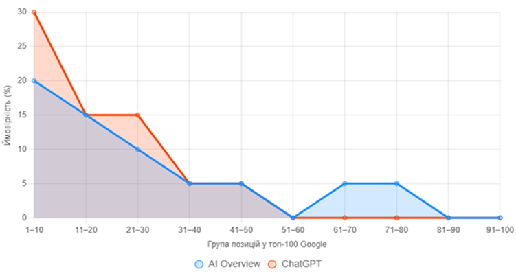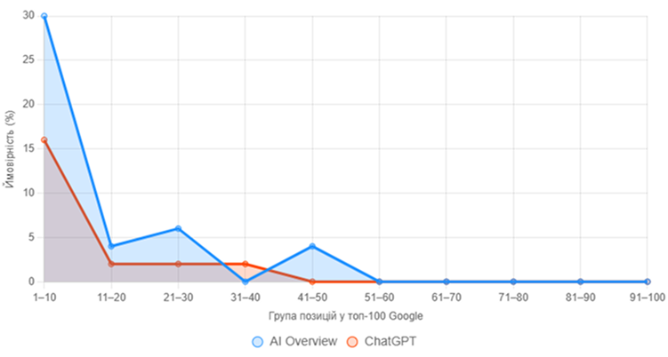 Вероятность попадания URL в AI Overview и ChatGPT (украинская выдача)