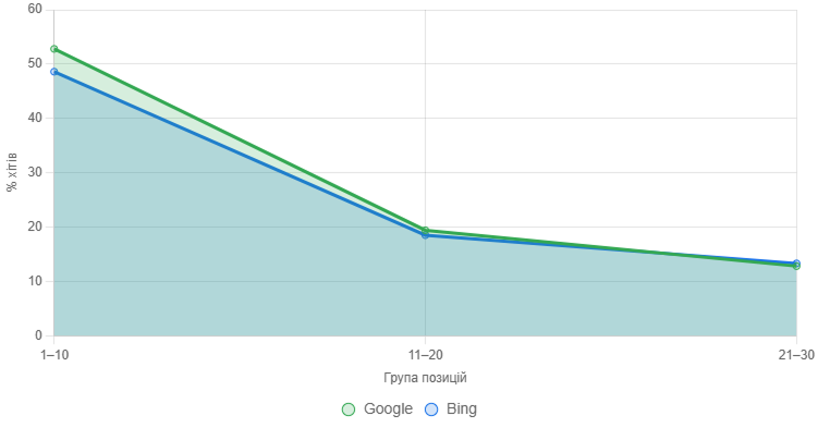 | Hit rate из топ-30 | 65–85% | 55–75% | Google показывает более высокий результат благодаря более широкому объему данных. Bing стабилен, но ограничен глубиной выдачи. Для обзорных запросов (mental health, online learning) разница меньше: Google 80–90%, Bing 70–75% |