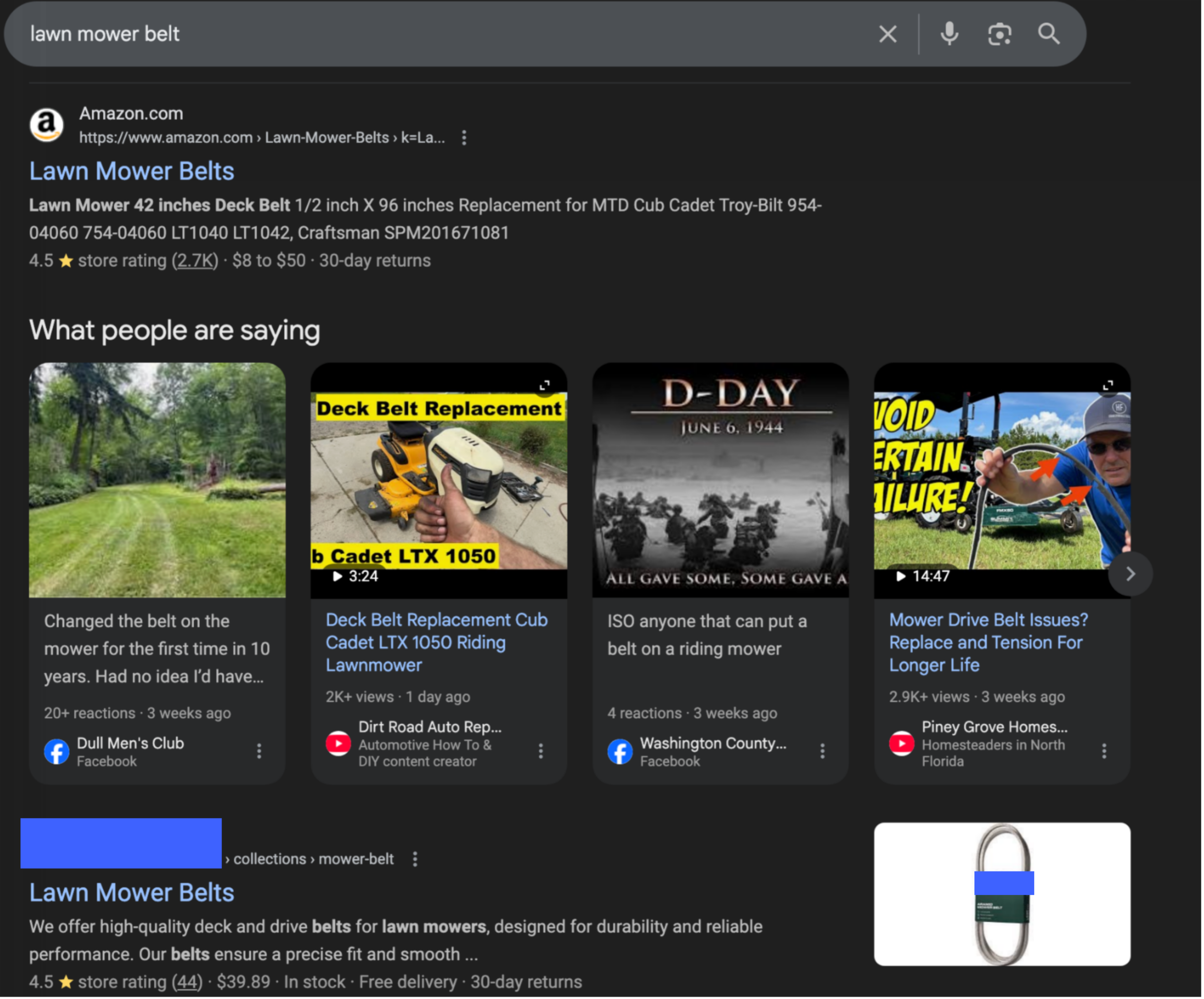 Сайт клиента это довольно небольшой и узкоспециализированный интернет-магазин, которому приходится конкурировать в американской поисковой выдаче с такими гигантами, как Amazon, eBay, а также с большими маркетплейсами, которые продают оригинальные запчасти для садовой техники известных производителей. И небольшим спойлером будет сказать, что за год нашей работы, по целевому ключевому запросу мы все же смогли приблизиться к Amazon, и занять первую после него позицию.