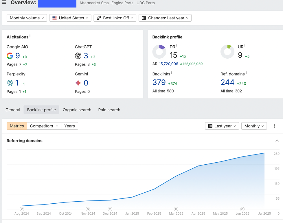 Когда к нам обратился клиент из Америки, специализирующийся на продаже OEM-аналогов для садовой техники, сайт практически не имел органического трафика. Вся видимость строилась на платной рекламе, контент на сайте не был организован, а также не было четкой SEO-стратегии (не было понимания, какие запросы являются приоритетными, и какие страницы хотелось бы продвигать).