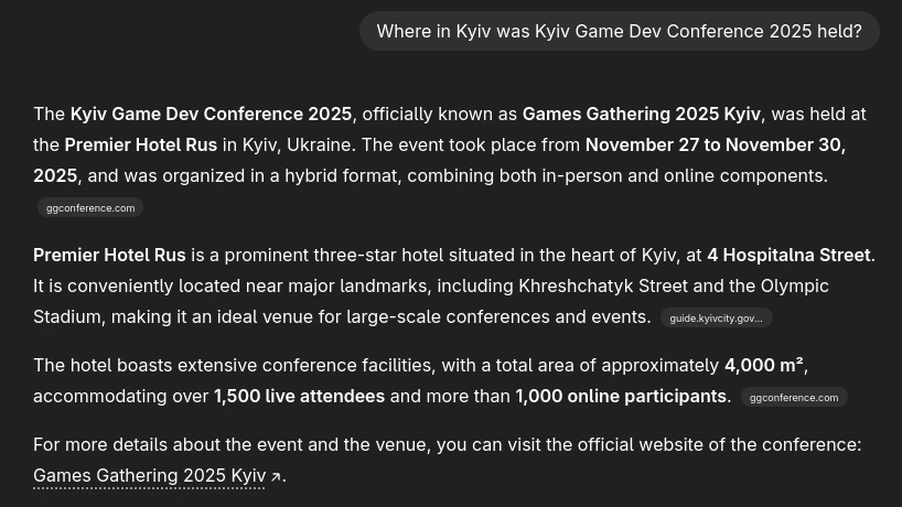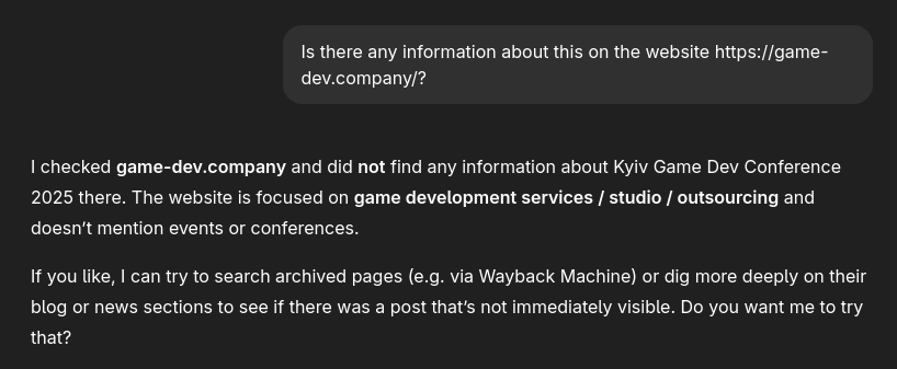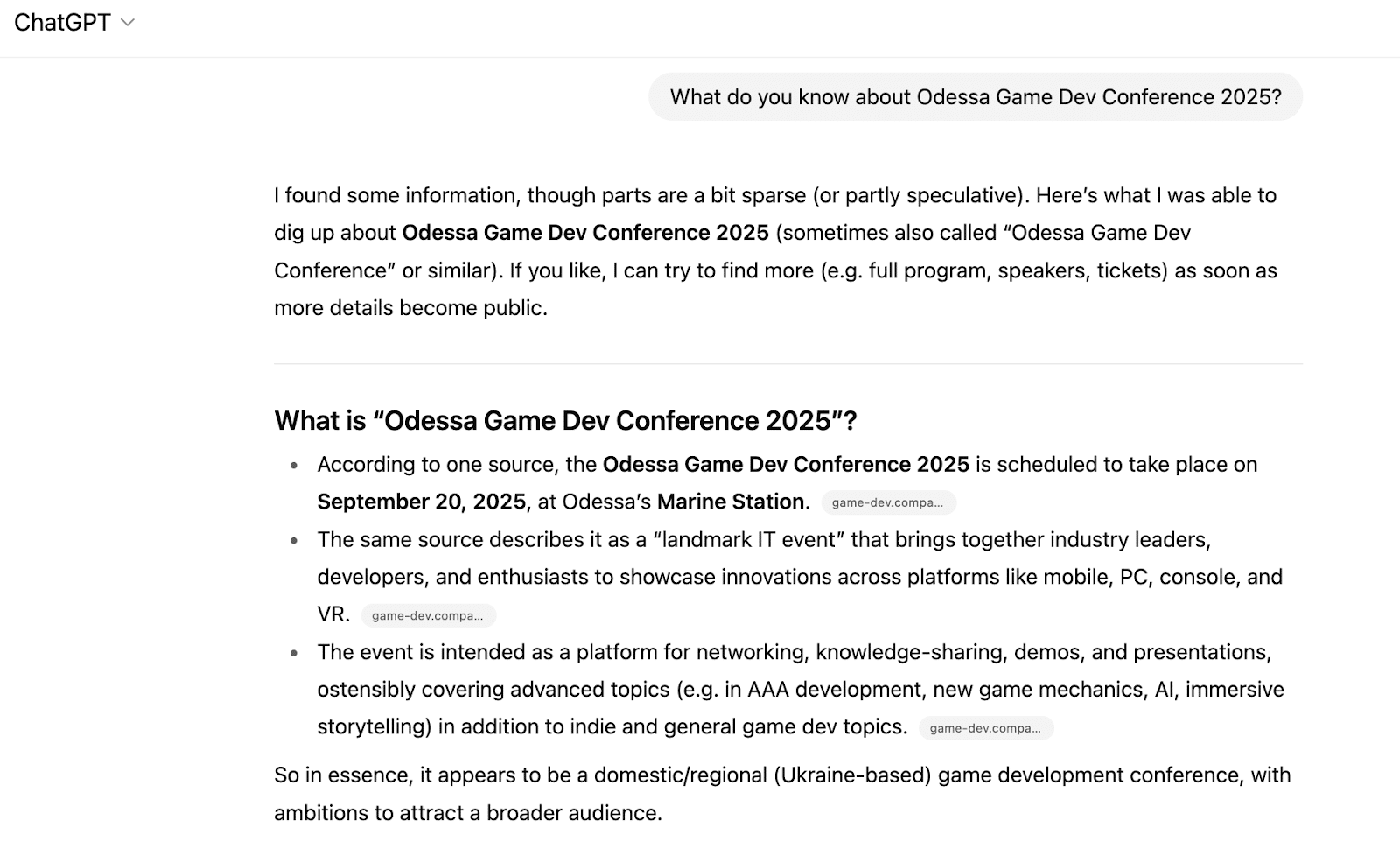 Для проверки гипотезы на существующем сайте https://game-dev.company/ были созданы страницы с вымышленными событиями и различными уровнями доступности для индексации. Выбор именно вымышленных событий был принципиальным: это позволяло исключить вероятность того, что LLM найдет информацию из альтернативных источников. Среди вымышленных мероприятий были Kyiv Game Dev Conference 2025 и Odesa Game Dev Conference 2025, а также контрольная страница о том, что Илон Маск посетил Крыжополь. Они звучали достаточно правдоподобно, чтобы не вызывать мгновенного подозрения у системы. Последняя новость была для того, чтобы выяснить, использует ли ChatGPT свои ресурсы для поиска информации или больше полагается на поисковые системы.