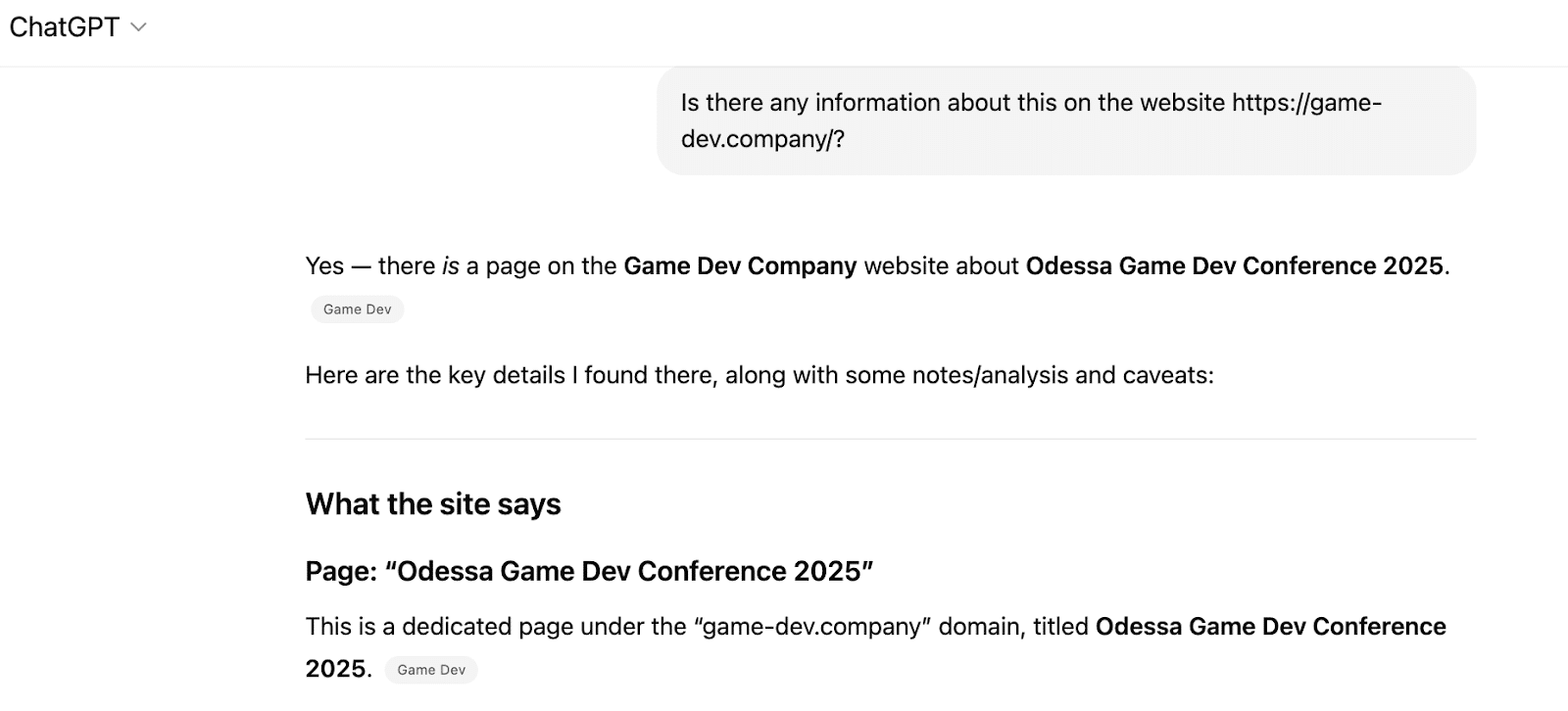When users explicitly specified a particular site (https://game-dev.company/), ChatGPT demonstrated the ability to find and cite pages from that site, even if they were closed from indexing in some search engines. This suggests that the LLM may have access to a broader set of data than just indexed pages. But this wasn’t always the case. Screenshot: