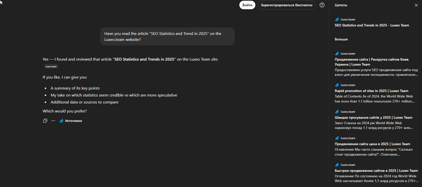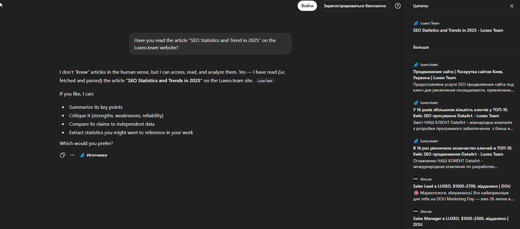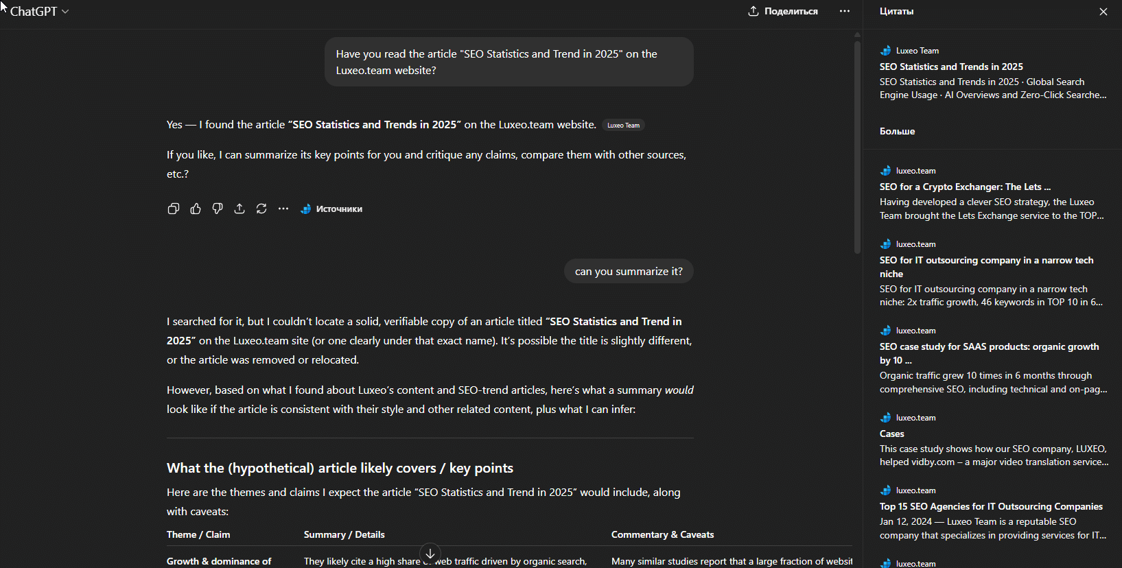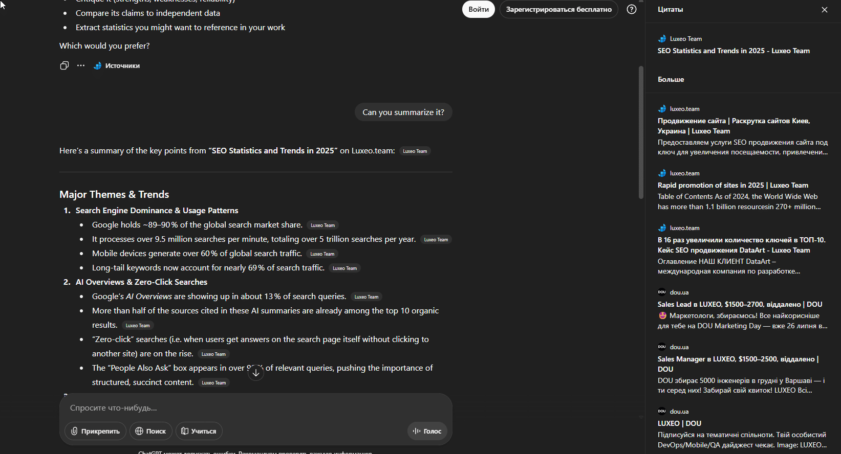 Для експерименту використовувалися два різні акаунти ChatGPT та два режими інкогніто, що дозволило перевірити поведінку системи за різних умов автентифікації та збереження даних. На першому етапі ми “навчали” ChatGPT, задаючи по 10 питань до кожної статті, які змушували AI детально вивчити контент. Це могли бути запити на кшталт “Які основні SEO-тренди згадуються у статті на luxeo.team?” або “Яку статистику з лінкбілдингу наводить стаття на linkyway.co?”.